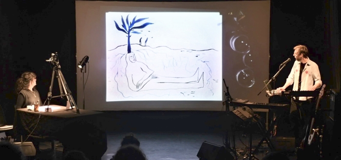 L'illustratrice est filmée à l'aide d'un dispositif vidéo (banc-titre, caméra et vidéoprojection) et est accompagné par le musicien (violon, machines et voix).